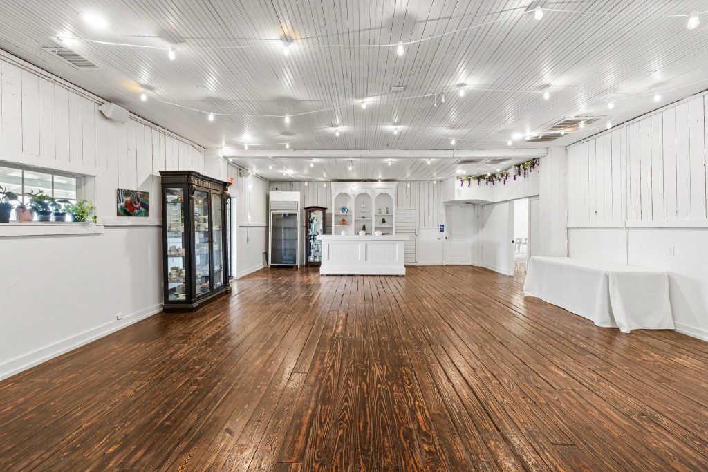 This beautiful 2,500+ sq. foot space is an ideal location for a large gathering. We can seat 150 comfortably, and 120 with a dance floor. With neutral white décor accented by crystal pendant lights and fairy lighting strung above open beams, Heritage Rose Hall has a Modern Texas Farmhouse atmosphere with a variety of amenities at your disposal, including white farm tables, Chiavari crossback chairs, and our awesome 40-foot built-in bar.